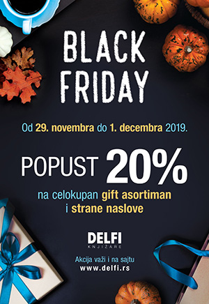 Od 29. novembra do 1. decembra Delfi knjižare će obeležiti Crni petak sniženjem celokupnog gift programa i stranih naslova za 20%. Akcija će se održati ne samo u svim Delfi knjižarama već i na sajtu www.delfi.rs.