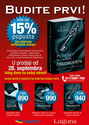 Na svim šalterima Pošte od 24. septembra sa popustom većim od 15% i besplatnom dostavom možete naručiti roman „Pedeset nijansi – Oslobođeni“, treći deo planetarnog književnog fenomena, erotske trilogije autorke E. L. Džejms. Knjiga će vam 28. septembra, kada će se naći i u knjižarskoj prodaji, biti dostavljena na vašu adresu. Sa istim popustom knjigu možete poručiti i putem Call centra Pošte na broj telefona 011/3607-709.
