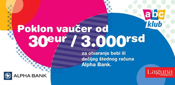 Laguna i Alpha banka poklanjaju vaučer u iznosu od 30 evra/3000 dinara uz bilo koju kupljenu Lagunu knjigu namenjenu deci i roditeljima. Ovaj vaučer vam omogućava da na vreme počnete da štedite za lepšu i sigurniju budućnost vašeg deteta. Sve detalje kako da ostvarite ovu posebnu pogodnost možete dobiti knjižarama Delfi i Laguninim klubovima čitalaca, kao i u filijalama Alpha banke, veb-sajtu banke www.alphabankserbia.com ili pozivanjem Call Centra na broj 0800 250 250.