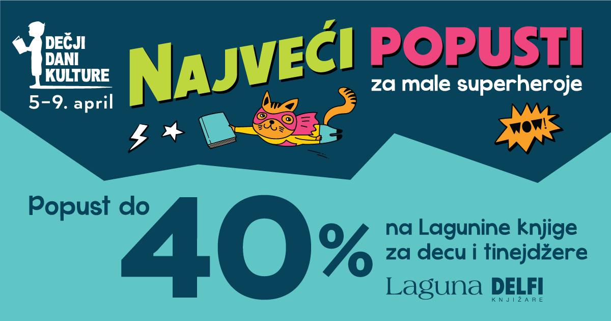 Očekuju vas veliki popusti na Lagunine knjige za decu i druženja sa piscima! Popust na jednu Laguninu knjigu za decu iznosiće 25%, na dve 30%, na tri 35%, a na četiri ili više knjiga 40%. Navedeni popusti primenjivaće se i na Dexy Co. i Egmontova izdanja, ali bez mogućnosti da se kombinuju sa popustima na izdanja drugih izdavača. Naslovi odabranih izdavača biće na popustu od 20%, dok će odabrani gift program biti snižen do 20%. Navedeni popusti se ne mogu kombinovati sa drugim popustima i akcijama.