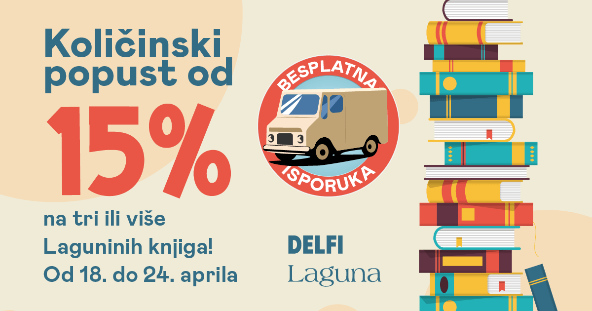 Od 18. do 24. aprila količinski popust na tri i više izdanja Lagune biće povećan na 15%, umesto dosadašnjih 10%, u svim knjižarama Delfi i na sajtovima laguna.rs i delfi.rs.