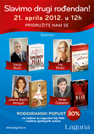 Mnogi čitaoci koji sa velikim zadovoljstvom posećuju ovo mesto u centru Novog Sada moći će u subotu da se druže sa Laguninim piscima Jelenom Bačić Alimpić, Ivom Štrljić, Vanjom Bulićem i Vanjom Čobanovim. Posebno za ovu priliku knjige sa Lagunine top-liste biće na popustu od 30 odsto kao i knjige gostujućih autora. Poslastičarnica „Mocart“ pripremiće rođendansku tortu – poslasticu za sve posetioce.