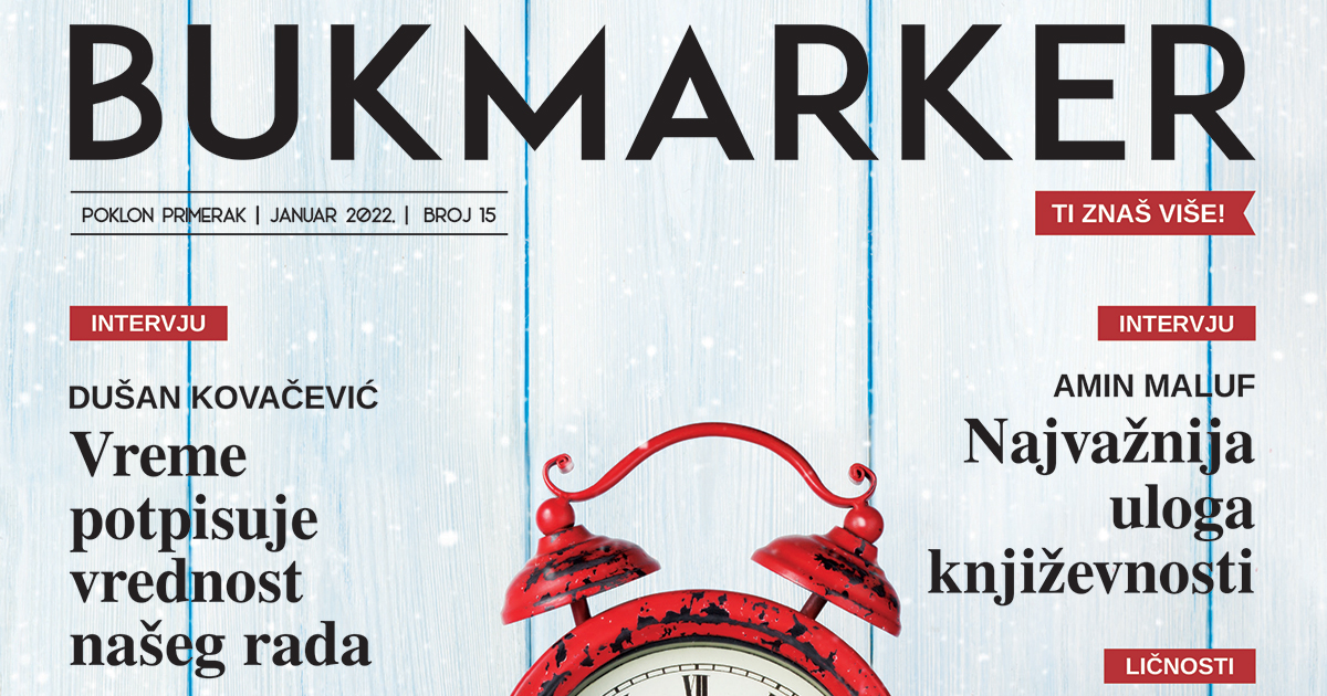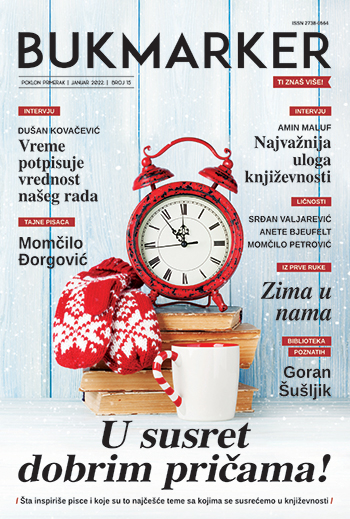 Novu Bukmarker godinu započinjemo ekskluzivnim intervjuima sa Dušanom Kovačevićem i Aminom Malufom. Razgovarali smo i sa Momčilom Petrovićem, autorom „Zanimljive istorije Srba u 147 priča“, koji je jedan od najčitanijih autora u 2021, Srđanom Valjarevićem jer 15 godina posle romana „Komo“ imamo priliku da čitamo njegovu novu knjigu „Fric i Dobrila“, kao i sa danskom autorkom Anete Bjeufelt, koja je svojim debi romanom „Kad ti život uvali nilskog konja“ oduševila čitaoce širom sveta.