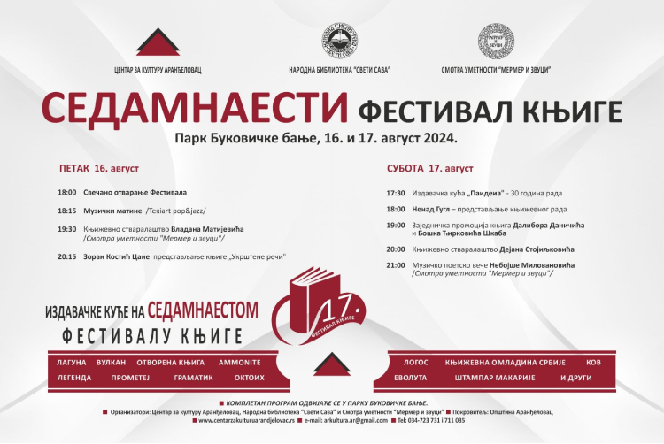 U jednom od najlepših i najpoznatijih parkova u Srbiji, parku Bukovičke banje u Aranđelovcu, u hladu stoletnih platana, i ove godine posetioci će se družiti sa knjigama i piscima. Sedamnaesti Festival knjige biće održan 16. i 17. avgusta 2024. uz brojne promocije, razgovore i umetničke sadržaje.