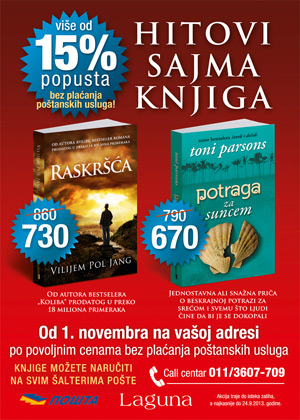 Sajam knjiga se završio a vi niste stigli da kupite omiljene naslove. Ne brinite! Na svim šalterima Pošte Srbije od 1. novembra, sa popustom većim od 15% i besplatnom dostavom možete naručiti najtraženije knjige 57. Međunarodnog sajma knjiga u Beogradu, „Raskršća“ Vilijema Pola Janga i „Potragu za suncem“ Tonija Parsonsa. Knjige će biti dostavljene na vašu adresu bez plaćanja poštankih troškova. Sa istim popustom knjigu možete poručiti i putem Call centra Pošte Srbije na broj telefona 011/3607-709.
