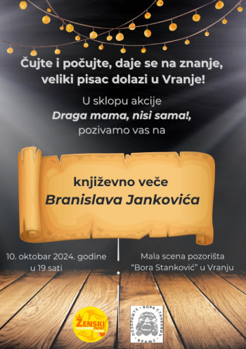 Književno veče humanitarnog karaktera održaće se na Maloj sceni pozorišta „Bora Stanković“, na poziv Ženskog solidarnog pokreta (grupe jakih i hrabrih vranjskih žena), koji je osnovan s ciljem pružanja podrške majkama dece sa smetnjama u razvoju, obezbeđivanjem medicinskih usluga, odeće i obroka.