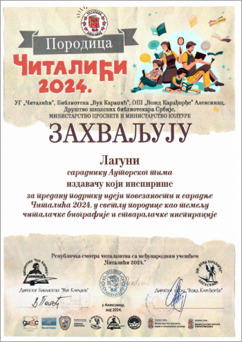 Laguna je dobila priznanje kao saradnik Autorskog tima i izdavač koji inspiriše za podršku ideji povezanosti i saradnje „Čitalića 2024.“ u svetlu porodice kao temelju čitalačke biografije i stvaralačke inspiracije.