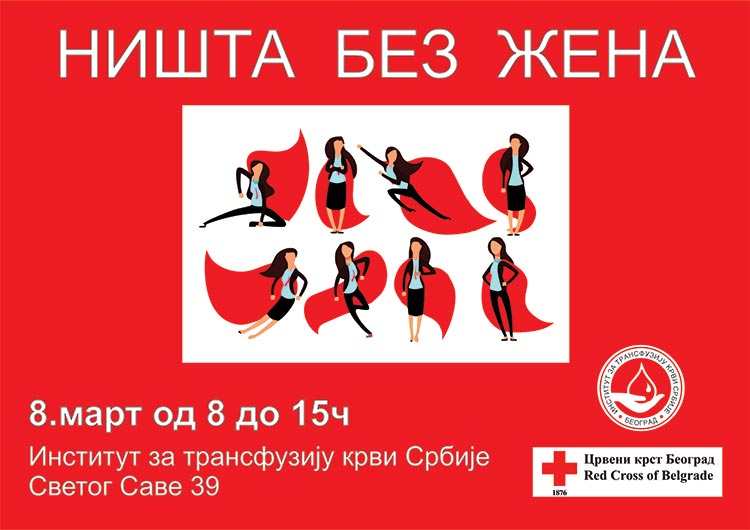 Pod sloganom „Ništa bez žena“ Institut za transfuziju krvi Srbije i Crveni krst Beograda već deset godina organizuju akciju dobrovoljnog davanja krvi. Obeležavajući na taj način Dan žena, 8. mart, zahvaljuju se svim ženama davaocima krvi i podstiču one koje dosad nisu davale krv.