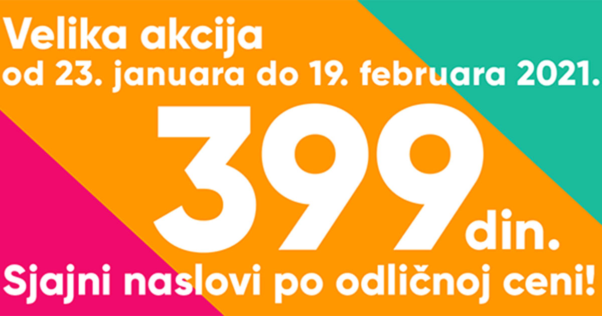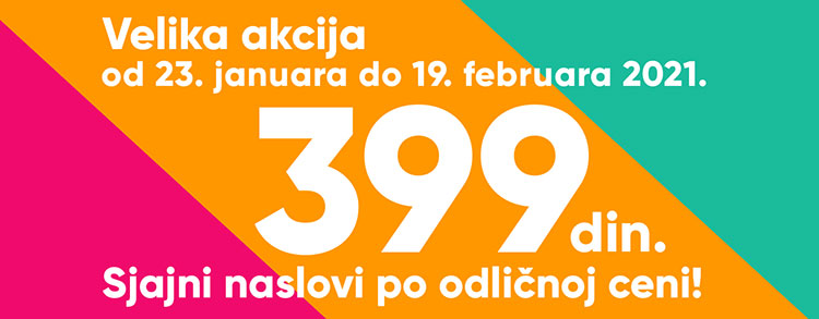 I u Novoj godini produžavamo akciju „399 – sjajni naslovi po odličnoj ceni“. Lista naslova u ponudi je osvežena i na njoj se nalazi deset novih knjiga po ceni od 399 dinara, koje možete nabaviti u periodu od 23. januara 2021. do 19. februara 2021. u svim knjižarama Delfi, Laguninim klubovima čitalaca u Srbiji, onlajn knjižari www.delfi.rs i na sajtu www.laguna.rs.