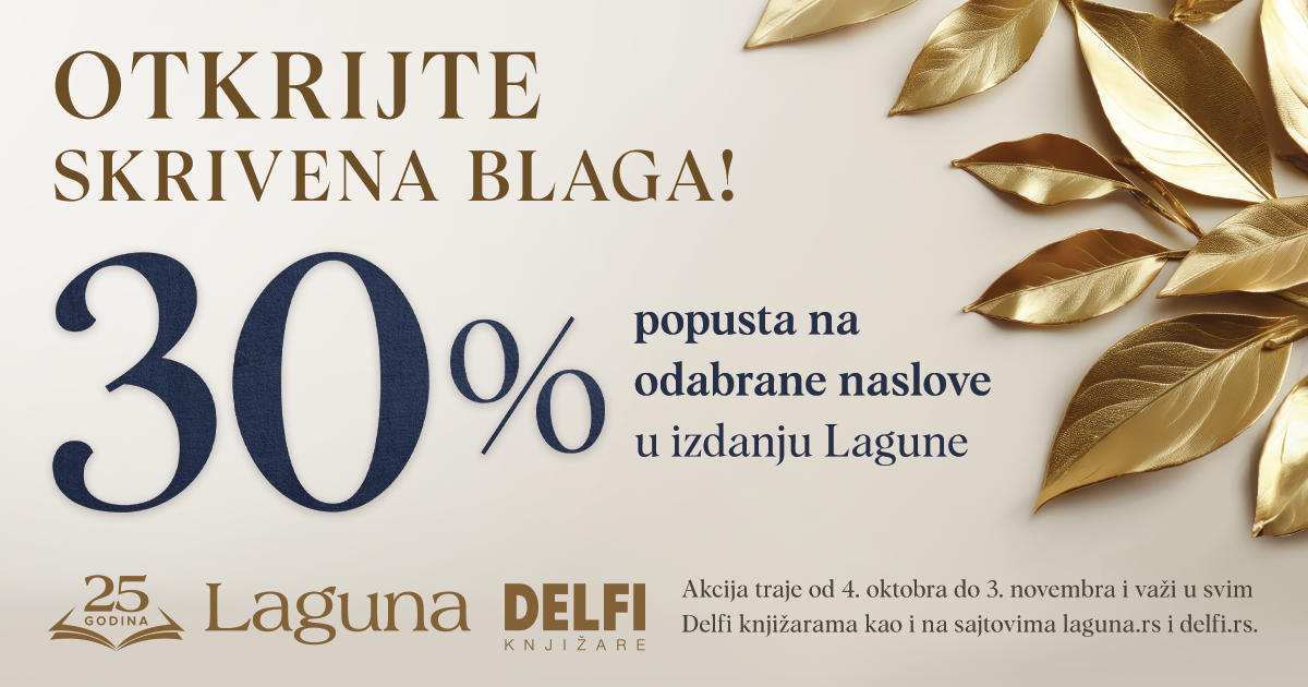 Od 4. oktobra do 3. novembra u svim knjižarama Delfi i na sajtovima laguna.rs i delfi.rs, na novih 30 odabranih naslova za velike i male u izdanju Lagune važiće popust 30%.