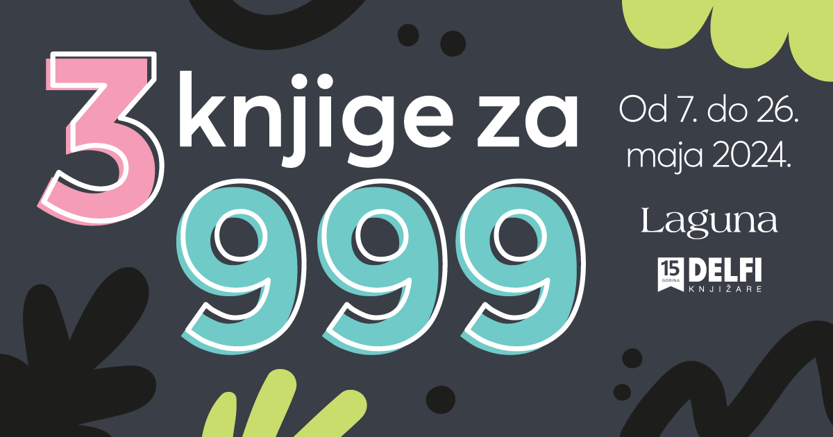Akcija koju najviše volite i uvek željno iščekujete, jer su tamo najbolji naslovi iz naše ponude – „3 za 999“ počinje 7. i traje do 26. maja 2024. godine, u svim Delfi knjižarama, kao i na sajtovima laguna.rs i delfi.rs.