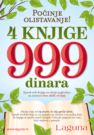 Laguna nastavlja sa odličnim akcijama  u Laguninim klubovima čitalaca i knjižarama Delfi. Od ponedeljka 19. marta do nedelje 29. aprila očekuje vas neverovatna akcija u kojoj će uživati svi ljubitelji lepih knjiga. Po ceni od 999 dinara možete ostvariti kupovinu četiri bestseler naslova.