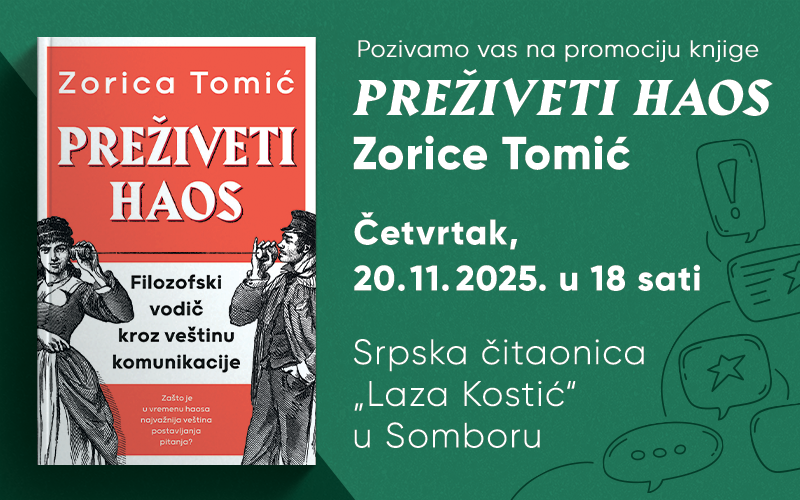 U četvrtak 20. novembra od 18 sati, u Srpskoj čitaonici „Laza Kostić“, biće predstavljena knjiga prof. dr Zorice TomićPreživeti haos – filozofski vodič kroz veštinu komunikacije“.