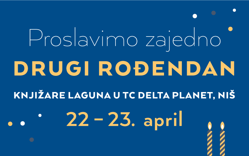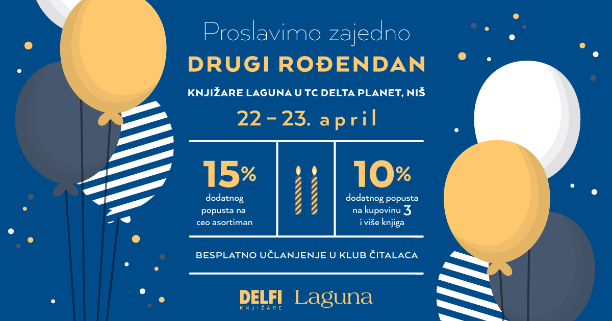 Knjižara Laguna u TC Delta Planet u Nišu postala je omiljeno mesto mnogih knjigoljubaca koji znaju da, pored naslova domaćih i svetskih hitova, mogu da pronađu i sjajan gift program. Od 22. do 23. aprila  Knjižara Laguna u TC Delta Planet proslaviće 2. rođendan, i  u tom periodu za sve posetioce biće priređen bogat program i mnogobrojna neverovatna iznenađenja!