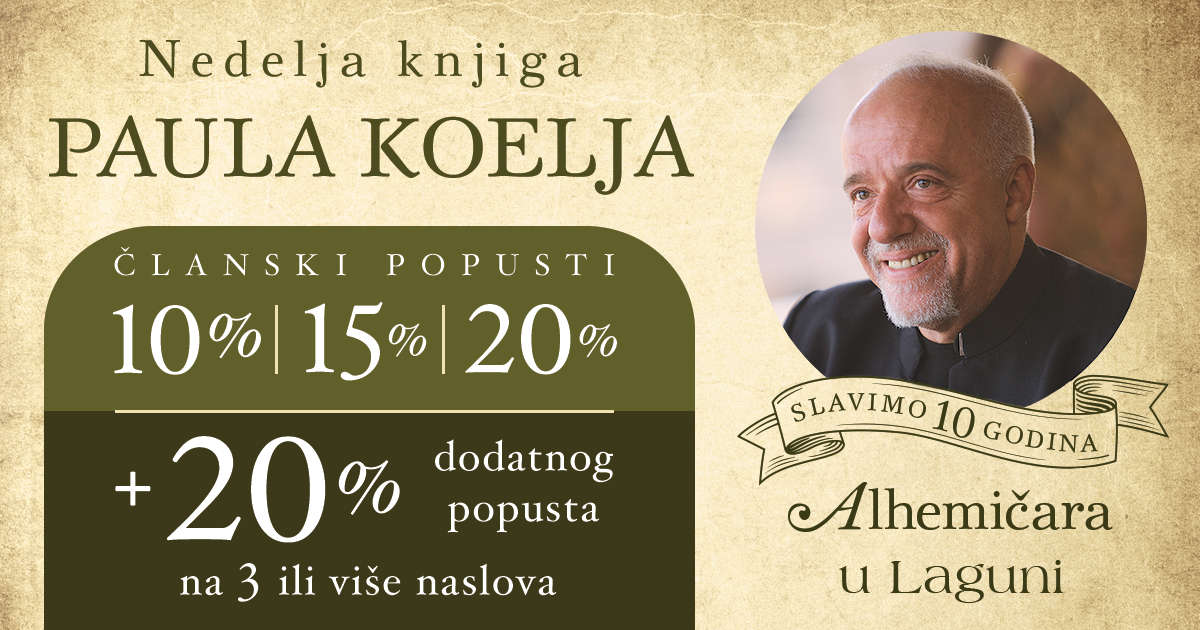Od 17. do 23. jula organizujemo Nedelju knjiga Paula Koelja, a tokom trajanja akcije za kupovinu 3 ili vše romana u izdanju Lagune, moći ćete da ostvarite 20% dodatnog popusta, umesto dosadašnjih 10%. Ovaj se popust može kombinovati sa članskim, kao i fiksnim popustom na delfi.rs.