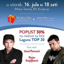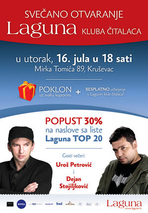 Čast da se zvanično najavi početak rada ove knjižare pripala je Laguninim piscima Urošu Petroviću i Dejanu Stojiljkoviću, koji će tom prilikom potpisivati svoje knjige.
