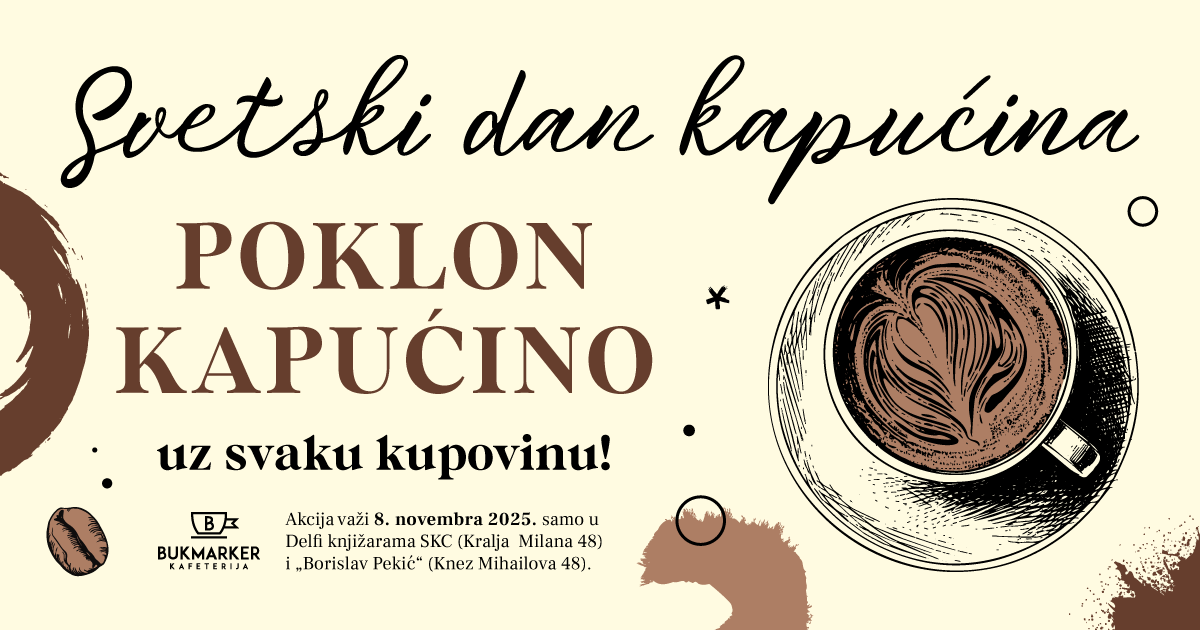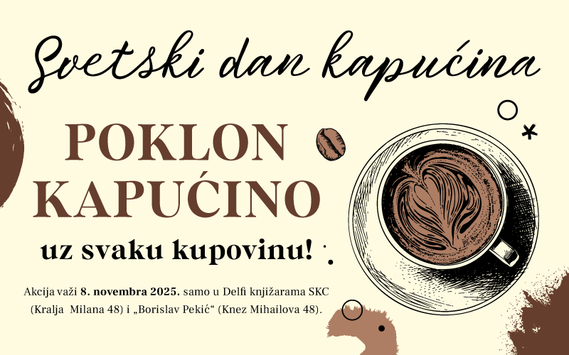 Na Svetski dan kapućina, 8. novembra 2025, u Delfi knjižarama SKC (Kralja Milana 48) i „Borislav Pekić“ (Knez Mihailova 48), uz svaku kupovinu na poklon dobijate kapućino.