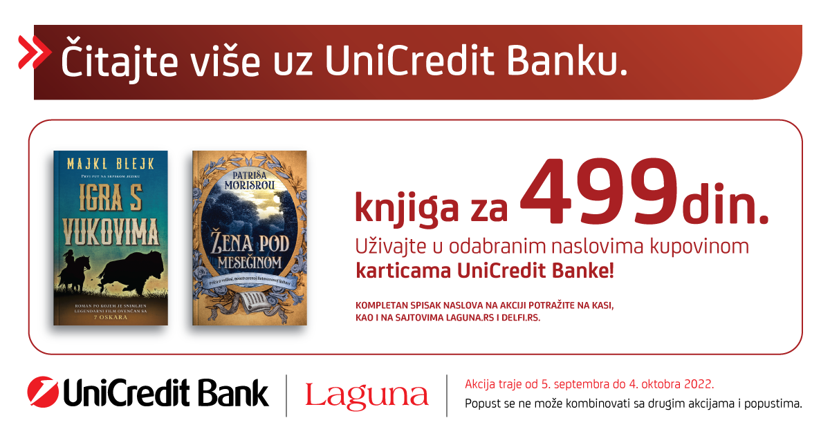 UniCredit banka i izdavačka kuća Laguna nastavljaju sa specijalnom akcijom koja traje od 5. septembra do 4. oktobra 2022. godine.