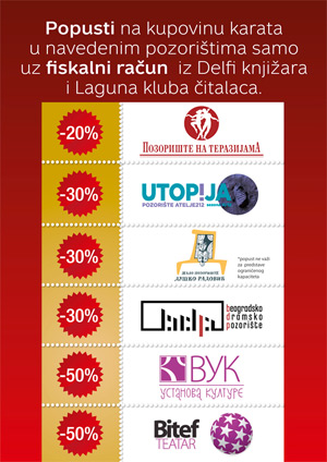 Popusti se ostvaruju na kupovinu karata u navedenim pozorištima samo uz fiskalni račun iz knjižara Delfi i Laguninih kluba čitalaca.