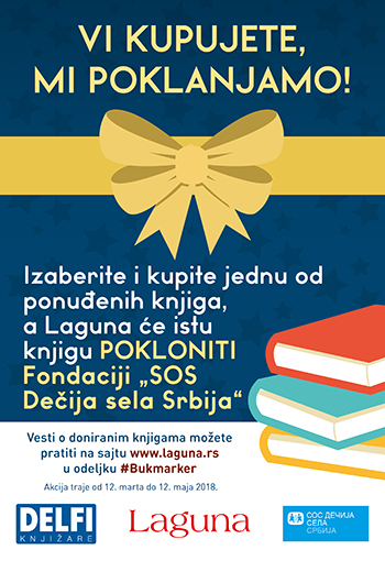 Ukoliko od 12. marta do 12. maja kupite jednu od preko 30 preporučenih knjiga u knjižarama Delfi ili Laguninim klubovima čitalaca, Laguna će istu knjigu pokloniti Fondaciji „SOS Dečija sela Srbija“!