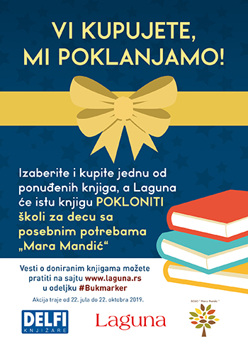 Izdavačka kuća Laguna i knjižare Delfi pokrenuli su humanitarnu akciju „Vi kupujete, mi poklanjamo“. Zahvaljujući njoj, biblioteke Svratišta za decu, Fondacije SOS dečja sela Srbije, Centra za zaštitu odojčadi, dece i omladine u Zvečanskoj i Nacionalnog udruženja roditelja dece obolele od raka Nurdor postale su bogatije za više od 4.000 sjajnih knjiga za decu.