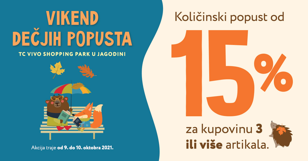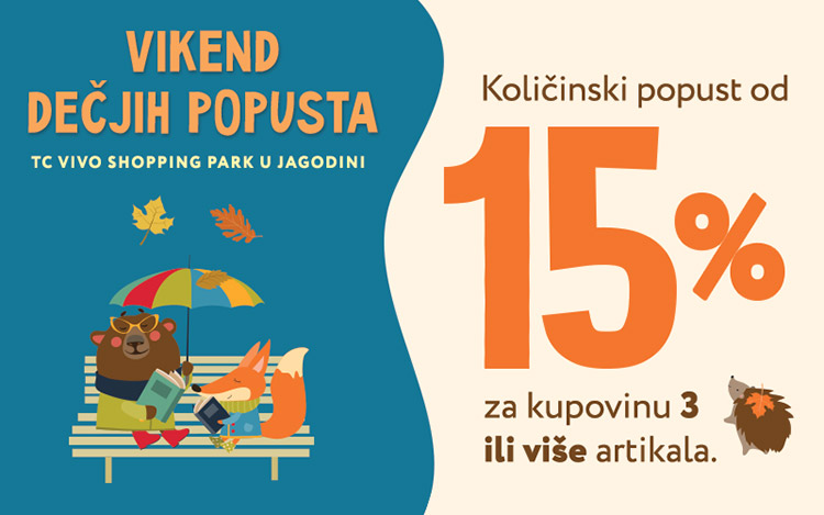 Samo predstojećeg vikenda 9. i 10. oktobra u knjižari Laguna u Jagodini u VIVO shopping parku očekuje vas uvećani količinski popust od 15% na kupovinu 3 ili više Laguninih knjiga za decu ili artikala iz dečjeg gift programa. Ovaj popust se može kombinovati sa članskim popustom Laguninog kluba čitalaca.