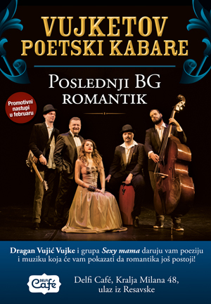 Vujketov poetski kabare „Poslednji beogradski romantik“ zabaviće vas ponedeljkom, 11, 18. i 25. februara od 20 sati u Delfi Caféu u SKC. Ulaz za posetioce Delfi Caféa je besplatan.