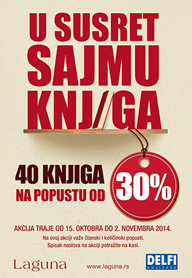 Od srede, 15. oktobra, u svim knjižarama Delfi, Laguninom klubu čitalaca u Resavskoj 33 i na sajtu www.delfi.rs očekuje vas 30% popusta na odabrane naslove.