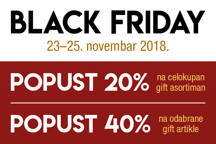 Od 23. do 25. novembra Delfi knjižare obeležiće Crni petak sniženjem celokupnog gift programa za 20%, a veliko sniženje od 40% je rezervisano za fantastičan asortiman Licenced products i Pyramide international.
