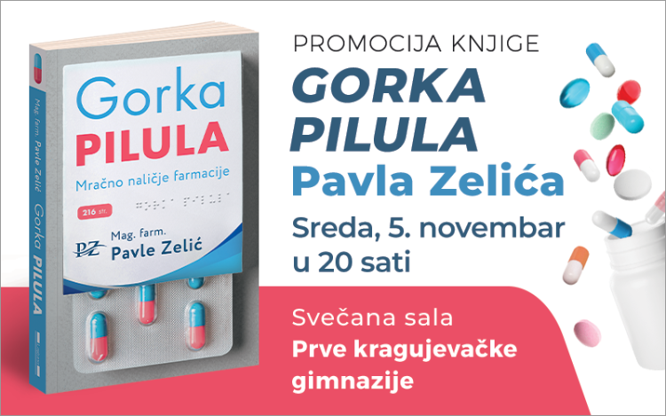 U Svečanoj sali Prve kragujevačke gimnazije, u sredu 5. novembra od 20 sati, održaće se promocija nove knjige Pavla Zelića, „Gorka pilula – Mračno naličje farmacije“. Autor, magistar farmacije, pisac i scenarista, poznat po romanima, zbirkama priča i stripovima, ovom knjigom ulazi u kompleksan svet farmaceutske industrije, otkrivajući njene tamne strane kao stručnjak i insajder koji iznosi brojne ekskluzivne informacije i otkrića o kojima ni javnost u svetu pa ni Srbiji ranije nije bila upoznata.