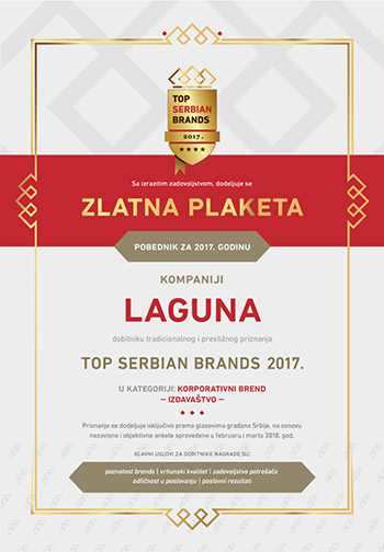 Izdavačka kuća Laguna, najveći izdavač u zemlji i regionu, po treći put dobitnik je prestižnog priznanja „Top Serbian Brands“ u kategoriji „Korporativni brend – izdavaštvo“.