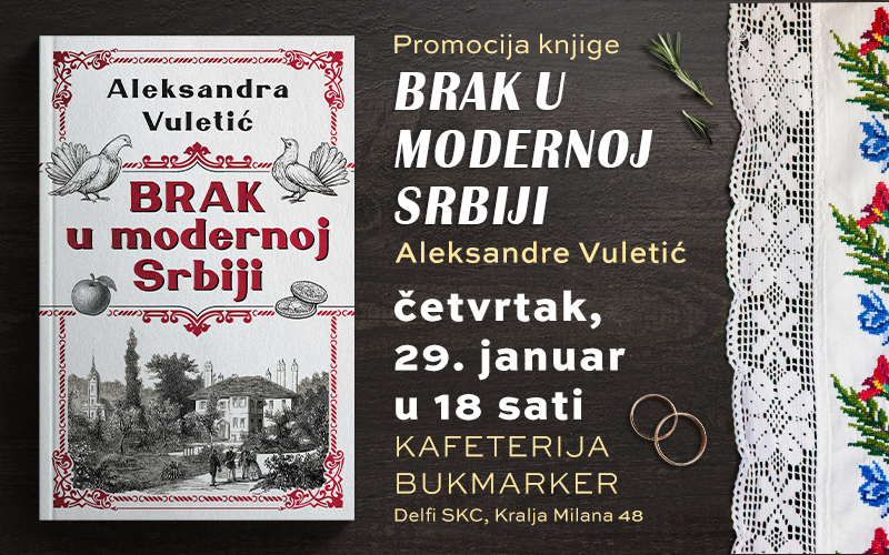 Knjiga istoričarke Aleksandre Vuletić „Brak u modernoj Srbiji“ sagledava brak kroz uticaje države, crkve, društva i pojedinca u Srbiji 19. i 20. veka – u vreme stvaranja moderne države i društva.