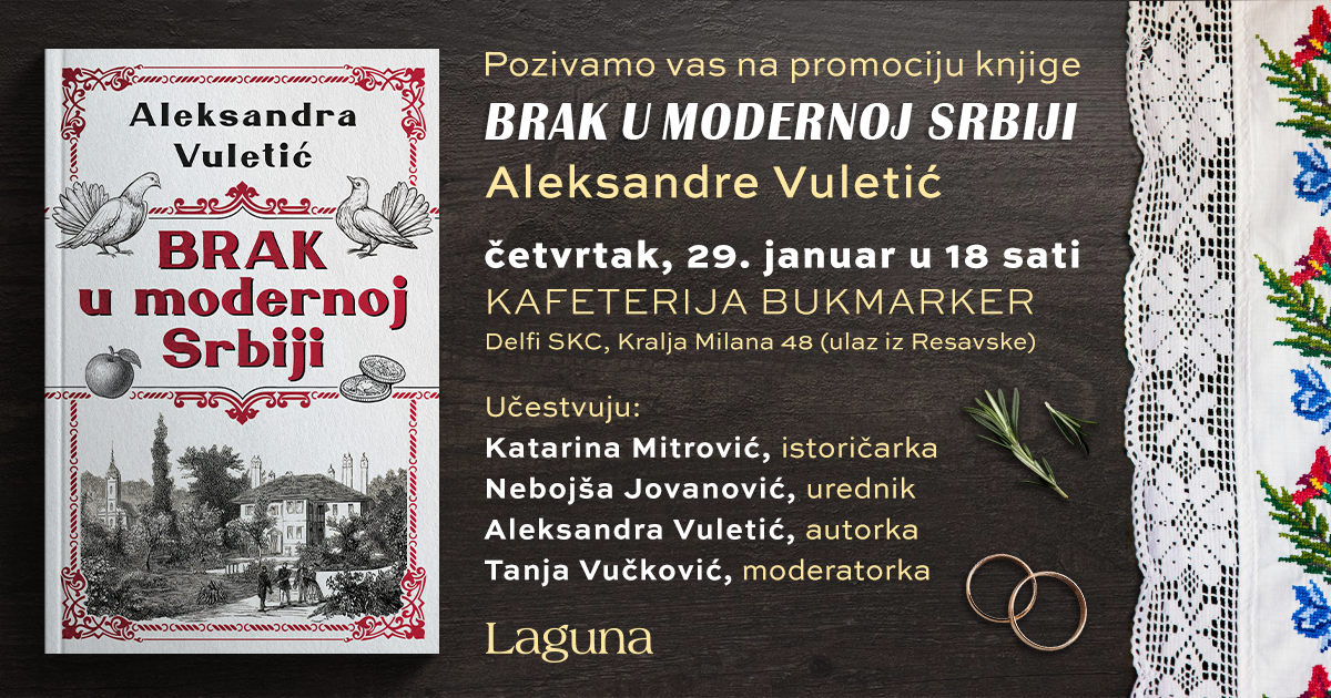 Brak u modernoj Srbiji“ koja otvara novo poglavlje u razumevanju privatnog i društvenog života u Srbiji 19. i 20. veka. O knjizi će, pored autorke, govoriti istoričarka Katarina Mitrović i urednik Nebojša Jovanović.