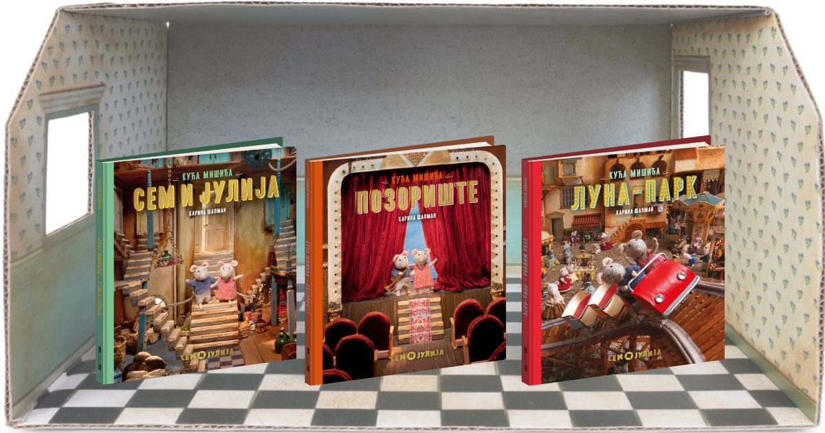 Karina: Dva mala miša – Sem i Julija. Iako su totalno različiti, oni su najbolji prijatelji. Julija je zasnovana na meni: radoznala je, otvorena i tvrdoglava, živi sama sa majkom u malom jednosobnom stanu... Sem je izuzetno povučen i veoma lepo vaspitan. On simbolizuje sve ono što nikada nisam imala: veliku porodicu sa mnogo braće, sestara i rođaka, i kuću sa više soba na dobroj lokaciji. Zajedno se upuštaju u avanture i upoznaju raznolike stanovnike o kojima svašta otkrivaju. Priče pišem ja i ilustrujem ih fotografijama Kuće mišića koju sam sama napravila.