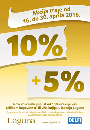 Nova akcija u knjižarama Delfi i ostalim Laguninim klubovima čitalaca, na sajtu www.laguna.rs i u onlajn knjižari www.delfi.rs omogućava svim kupcima da prilikom kupovine tri ili više Laguninih knjiga ostvare količinski popust od čak 15 odsto.