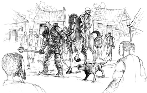 Prilika pred njima stajala je nepomično, s licem u tami, ali je svetlost iz pozadine jasno ocrtavala krupnu figuru – bio je to jak bradati čovek, velik gotovo kao i Žarko. Samo je stajao, netremice ih gledajući. Vuk tada primeti da su se otvorila i vrata na svim ostalim kolibama koje je mogao videti, i da na svakim stoji po jedna osoba. Sva vrata su gledala ka centru kruga, na veću kolibu pred kojom oni behu zastali. Bili su ukopani i izgubljeni, a sve te osobe gledale su u njih. Onda počeše polako da im prilaze. Nije bilo ničega pretećeg u ovom kretanju; znali su to čak i konj i pas, jer se nisu nimalo uznemirili. I, očas, begunci behu okruženi ljudima koji su ih znatiželjno posmatrali. Nije im prišao jedino onaj koji se prvi pojavio na vratima najveće kolibe, jer im on već beše na dohvatu ruke; kao da je samo čekao da se i ostali okupe, on progovori dubokim muškim glasom, istovremeno grubim ali i neizrecivo prijatnim: „Putnici, dobro došli u Morlak! Retka je prilika da ugostimo namernike u našem malom selu. Sjašite i uđite, jer je vreme za gozbu.“