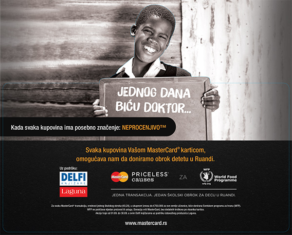 U periodu od 1. do 30. Septembra prilikom svake kupovine koju korisnici Mastercard i Maestro kartica obave u Delfi knjižarama širom Srbije, kao i u onlajn knjižari Delfi, bez obzira na iznos, Mastercard će donirati jedan školski obrok namenjen deci Ruande.