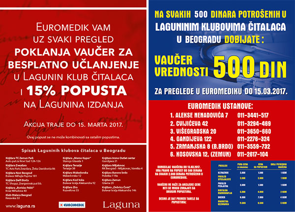 Na svakih potrošenih 500 dinara u Laguninim klubovima čitalaca u Beogradu dobijate vaučer za preglede u Euromediku. Ovaj vaučer možete iskoristiti za umanjenje svog računa u ustanovama tako što ćete na svakih 2000 dinara vrednosti vašeg računa iskoristiti jedan vaučer od 500 dinara.