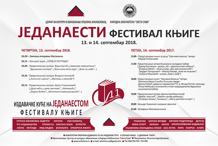 Jedanaesti festival knjige u Aranđelovcu, koji i ove godine organizuje Centar za kulturu iz Aranđelovca u saradnji sa Narodnom bibliotekom „Sveti Sava“, biće održan 13. i 14. septembra na Gradskom trgu.