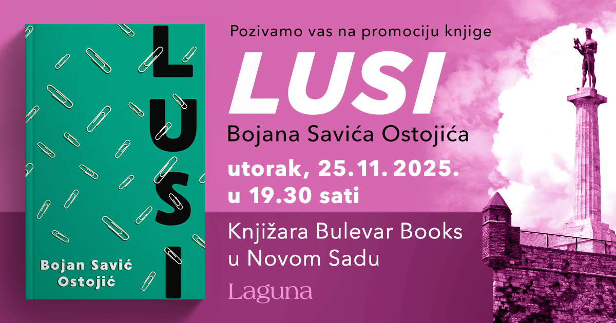 Roman „Lusi Bojana Savića Ostojića (Laguna, 2025) imaće prvu novosadsku promociju u knjižari Bulevar Books (Bulevar Mihajla Pupina 6) u utorak 25. novembra 2025. od 19.30.