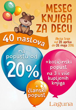 U svim Laguninim klubovima čitalaca od 20. aprila do 24. juna 2016. godine možete iskoristiti specijalni popust od 20% prilikom kupovine 40 sjajnih naslova. Na ovoj akciji važe količinski i članski popusti. Ova akcija važiće i na sajtu www.laguna.rs.