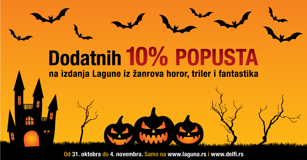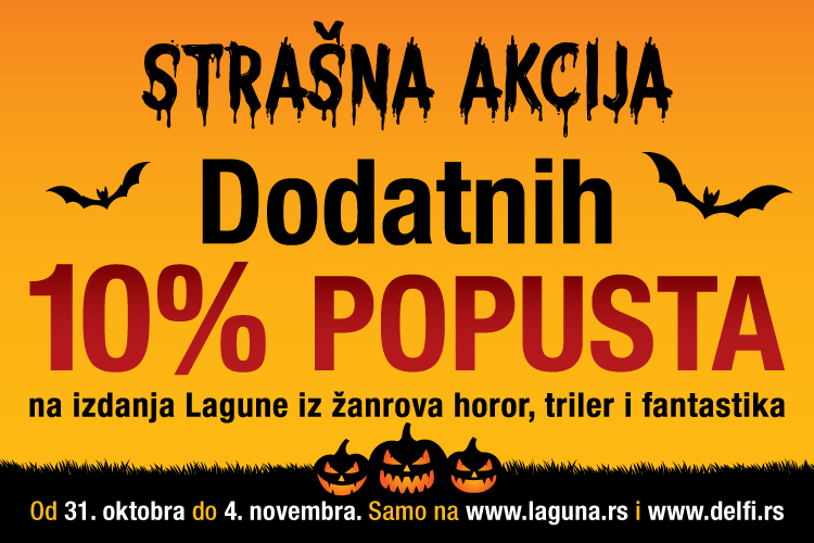 Povodom Noći veštica, praznika koji se širom sveta obeležava fantastičnim maskenbalima i šalama koje ponekad umeju da budu zastrašujuće, rešili smo da napravimo STRAŠNU akciju, u okviru koje će svi Lagunini naslovi iz žanrova horor, triler i fantastika (uključujući i epsku i komičnu) imati 10% snižene cene, a ovaj popust se može kombinovati sa članskim i količinskim.
