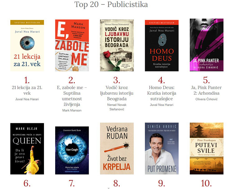 Na prvom mestu top-liste publicistike trenutno je nova knjiga Juvala Noe Hararija „21 lekcija za 21. vek“, dok naslov „Vatra i krv“ Džordža R. R. Martina zauzima prvo mesto na top-listi beletristike.