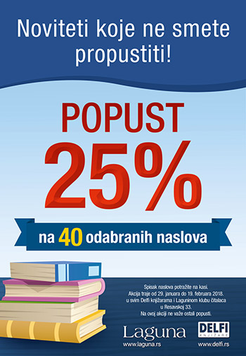 Od ponedeljka, 29. januara 2018. u svim knjižarama Delfi i Laguninom klubu čitalaca u Resavskoj 33 očekuje vas popust od 25% na 40 odabranih naslova.