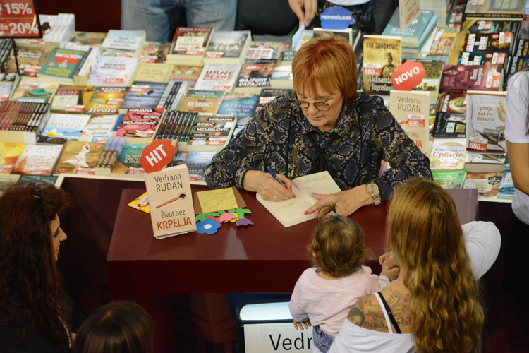 U 18 sati je svoje druženje sa čitaocima otpočela i Vedrana Rudan koja je svoju najnoviju knjigu „Život bez krpelja“ objavila samo u Laguni. Knjiga je svojevrsni nastavak njene prethodne zbirke tekstova pod naslovom „Zašto psujem“ koje je Vedrana Rudan poslednjih nekoliko godina objavljivala na svom blogu. Proteklih dana, na štandu Lagune su bili veoma traženi njeni romani „Kosturi okruga Medison“ i „Dabogda te majka rodila“. Članice Fejsbuk grupe Delfi kutak postavile su pitanja Vedrani na koja je ona odgovorila neposredno pre nego što je pošla na druženje sa čitateljkama.