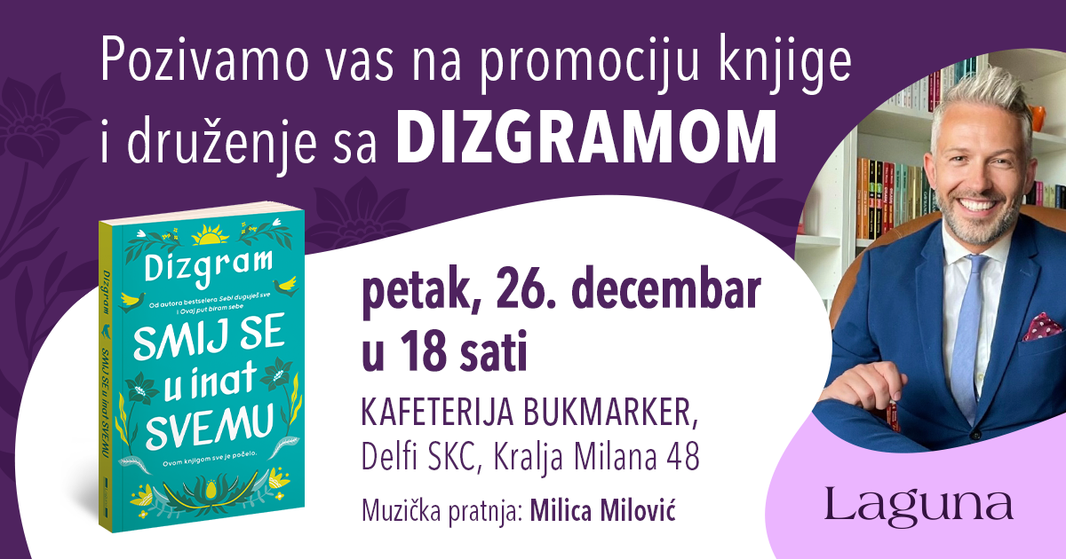 U petak 26. decembra od 18 sati u Bukmarker kafeteriji knjižare Delfi SKC biće predstavljena nova Dizgramova knjiga u izdanju Lagune „Smij se u inat svemu“.