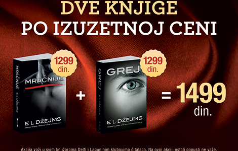 Izdavačka kuća Laguna pripremila je novu, divnu akciju za sve ljubitelje serijala „Pedeset nijansi“. Kupovinom najnovije knjige E L Džejms „Mračnije“, kupac može dobiti roman „Grej“ po specijalnoj ceni od 200 dinara.