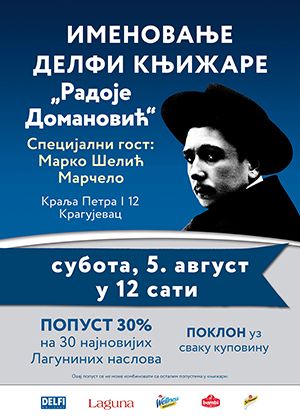 Izdavačka kuća Laguna i knjižarski lanac Delfi nastavljaju da dodeljuju knjižarama imena velikih srpskih pisaca i kulturnih pregalaca koji su ostavili značajan trag u našoj književnosti i kulturi. U subotu, 5. avgusta u 12 sati Delfi knjižara u Kragujevcu će poneti ime Radoja Domanovića, najvećeg srpskog satiričara čiju je knjigu „Ovako srećan narod“ upravo objavila Laguna.