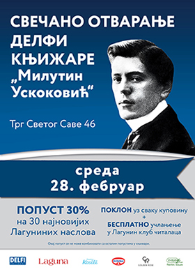 Izdavačka kuća Laguna i knjižarski lanac Delfi nastavljaju da dodeljuju knjižarama imena velikih srpskih pisaca i kulturnih pregalaca koji su ostavili značajan trag u našoj književnosti i kulturi. Još jedna u nizu je knjižara Delfi na Trgu Svetog Save 46 u Užicu, koja će 28. februara poneti ime „Milutin Uskoković“.