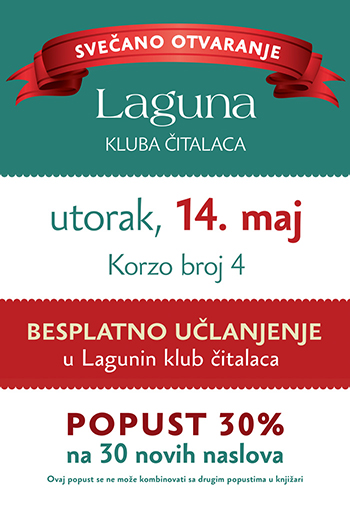 Za dan svečanog otvaranja pripremili smo posebne pogodnosti – besplatno učlanjenje u Lagunin klub čitalaca i specijalni popust od 30 odsto na 30 najnovijih Laguninih naslova. Ovaj popust se ne može kombinovati sa drugim popustima u knjižari.